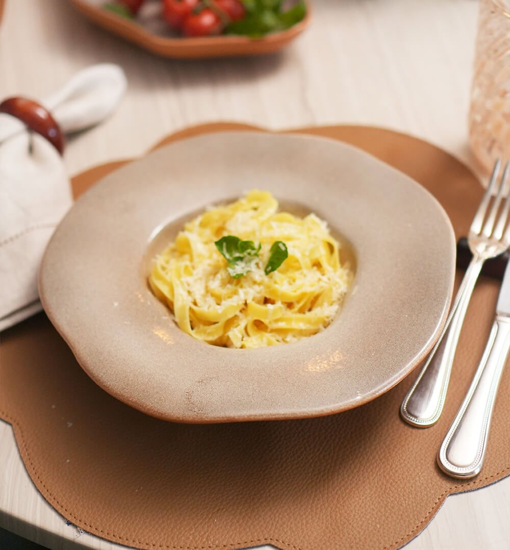 Sua versatilidade permite combinações perfeitas com outros itens da mesa, desde um almoço descontraído até um jantar sofisticado. A tonalidade neutra e a textura orgânica do prato se integram harmoniosamente com os mais variados acessórios.