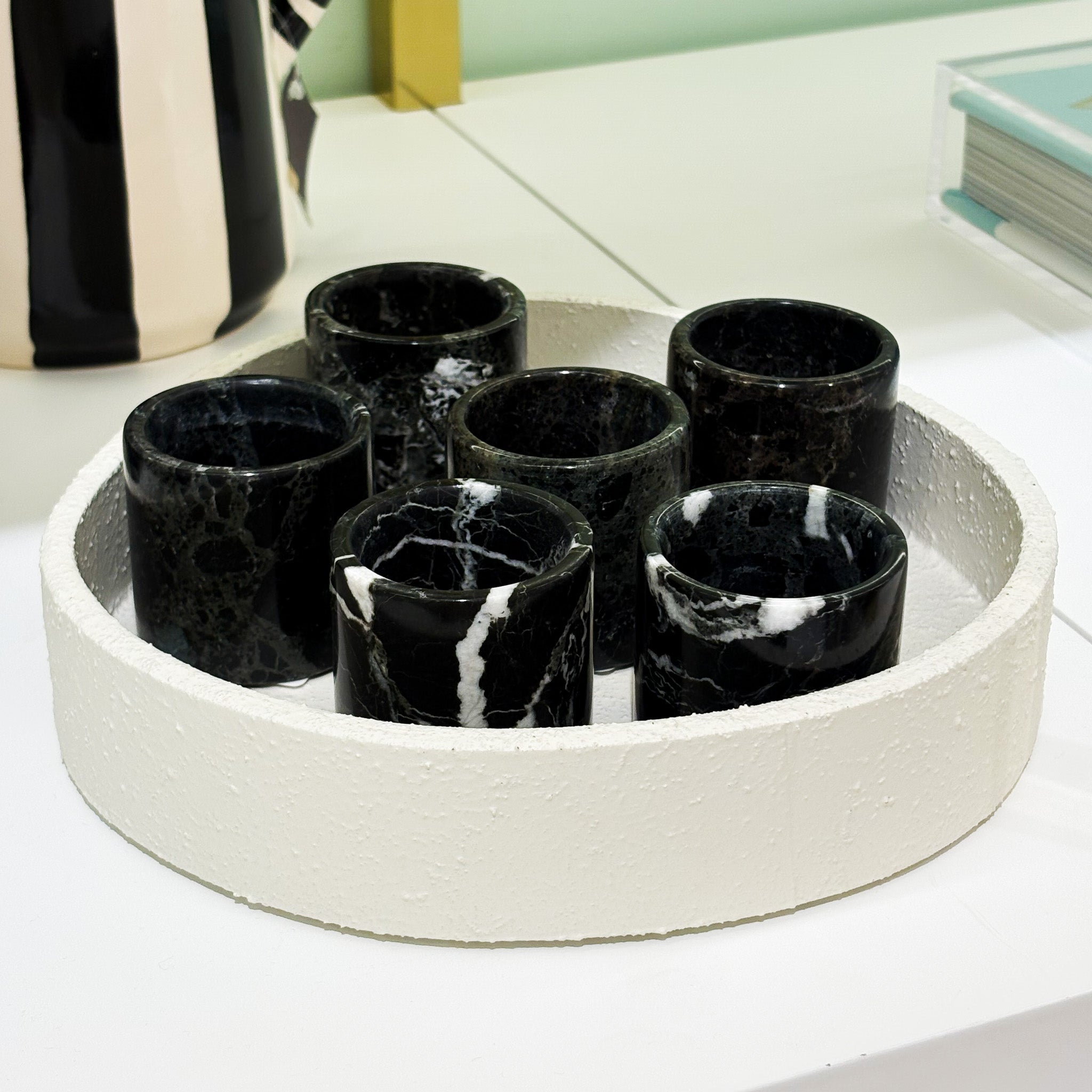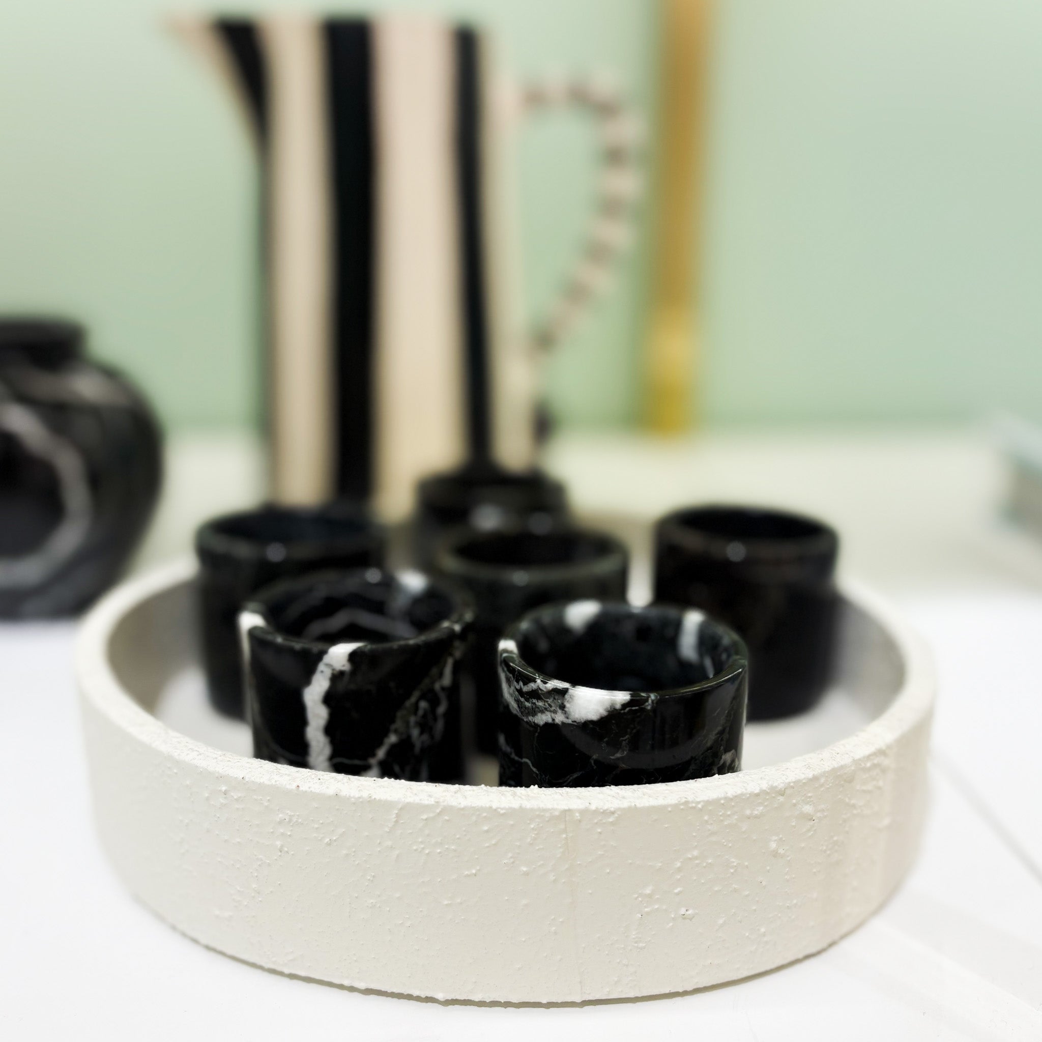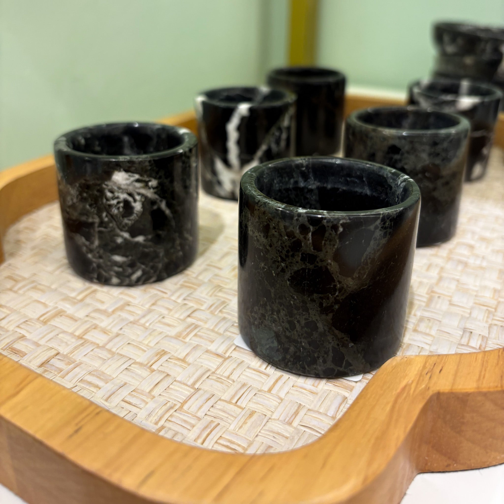 Este copo de saquê em pedra ônix preto é uma peça exclusiva e atemporal, perfeita para elevar seu jantar japonês. Com um design redondo e compacto, traz sofisticação para servir sake ou molhos.