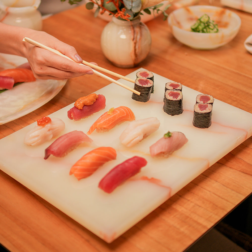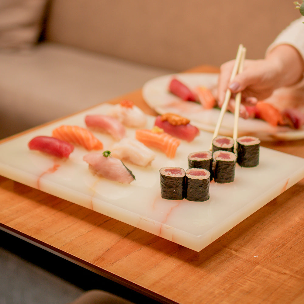 Utilize a tábua como base para apresentar queijos, sushi, e outros alimentos durante eventos ou refeições especiais, destacando sua beleza natural.