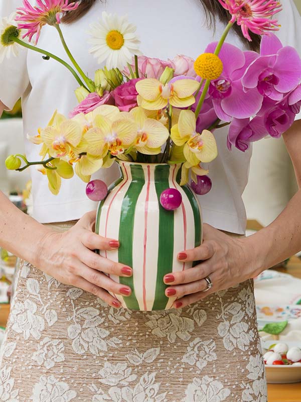 Vaso de Cerâmica Artesanal Lolahome, Grande (20cm), um produto Autoral e Exclusivo feito no Brasil. Com 4 pedras de Ágata, ele traz Elegância e Design Único em tons de Verde e Rosa para qualquer ambiente.