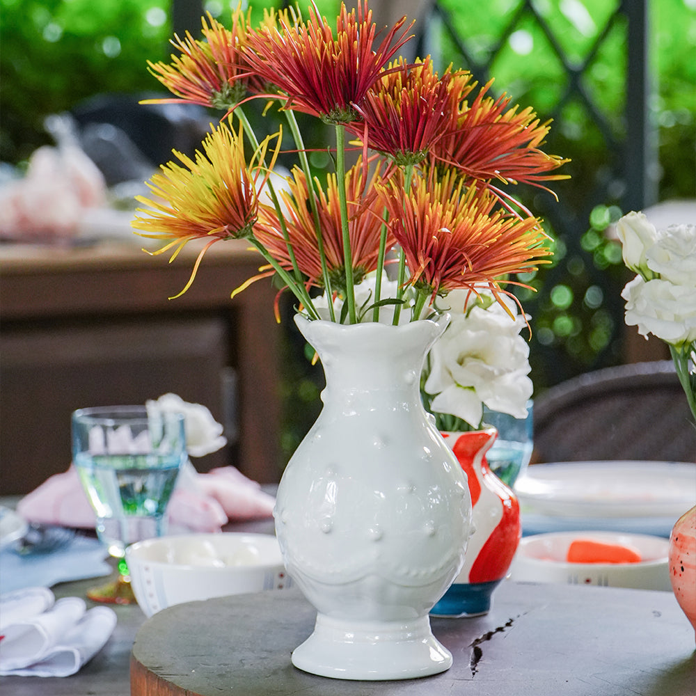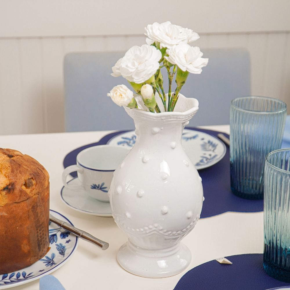 O vaso de cerâmica bolinhas branca é uma peça que vai trazer delicadeza e beleza para sua casa, ele é super versátil e vai incrementar a composição de vários ambientes. Ele tem detalhes em toda sua volta, desde a borda, que tem um formato ondulado, bolinhas e linhas que deixam o vaso único.