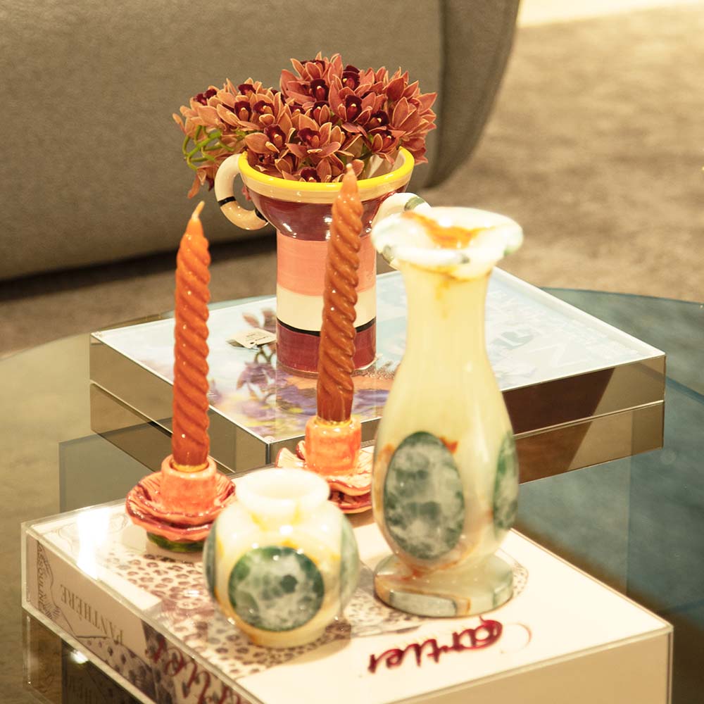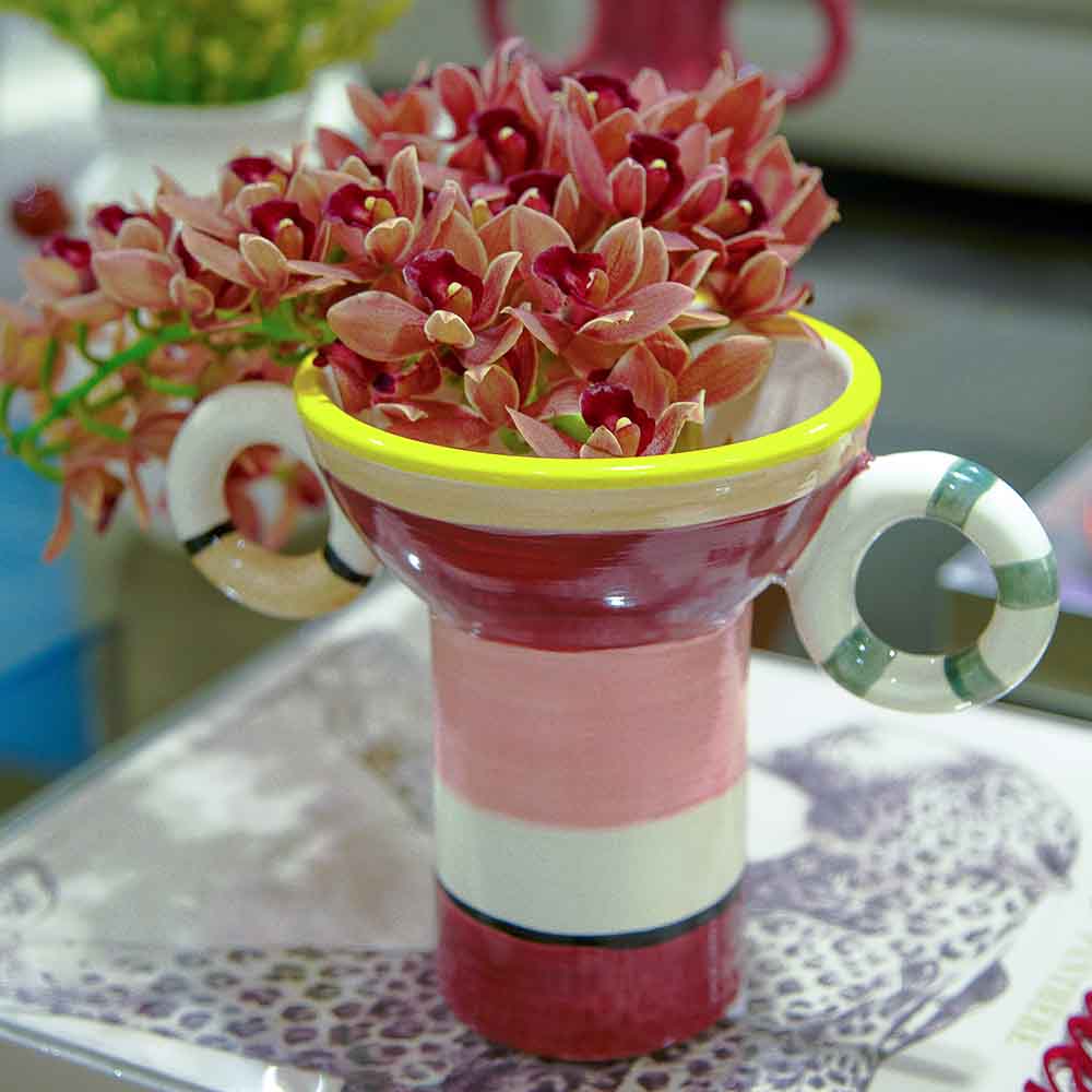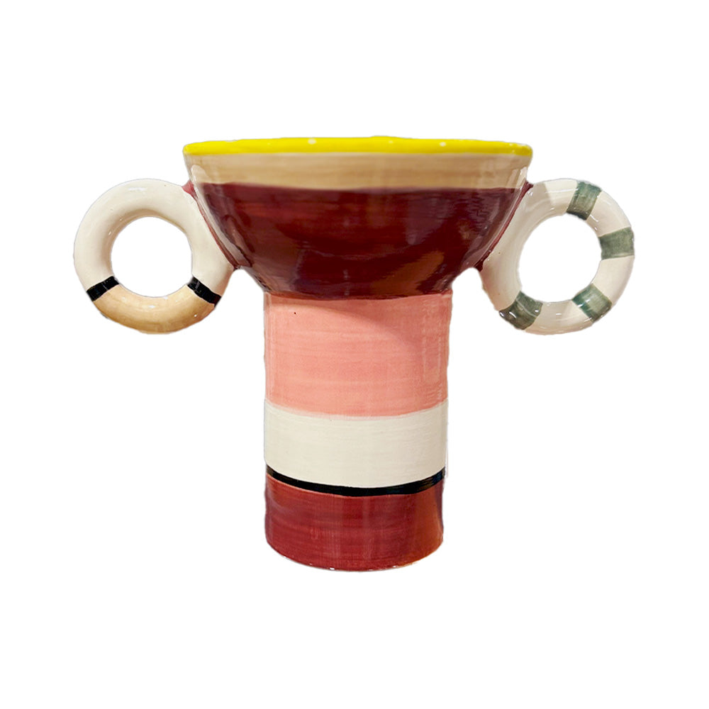Este vaso de cerâmica autoral da Lolahome é uma peça exclusiva, ideal para adicionar um toque de cor e design diferenciado à sua decoração. Suas listras em tons de branco, rosa, vinho e amarelo criam um visual moderno e cheio de personalidade.