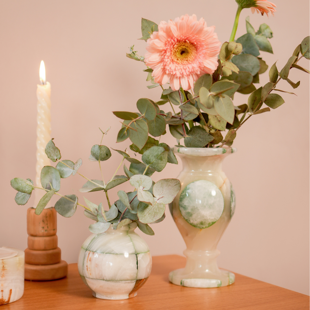 O ônix é um material delicado, então manuseie o vaso com cuidado para evitar quedas ou impactos que possam causar danos. Mantenha o vaso longe de ambientes com alta umidade para prevenir qualquer comprometimento do material ao longo do tempo.