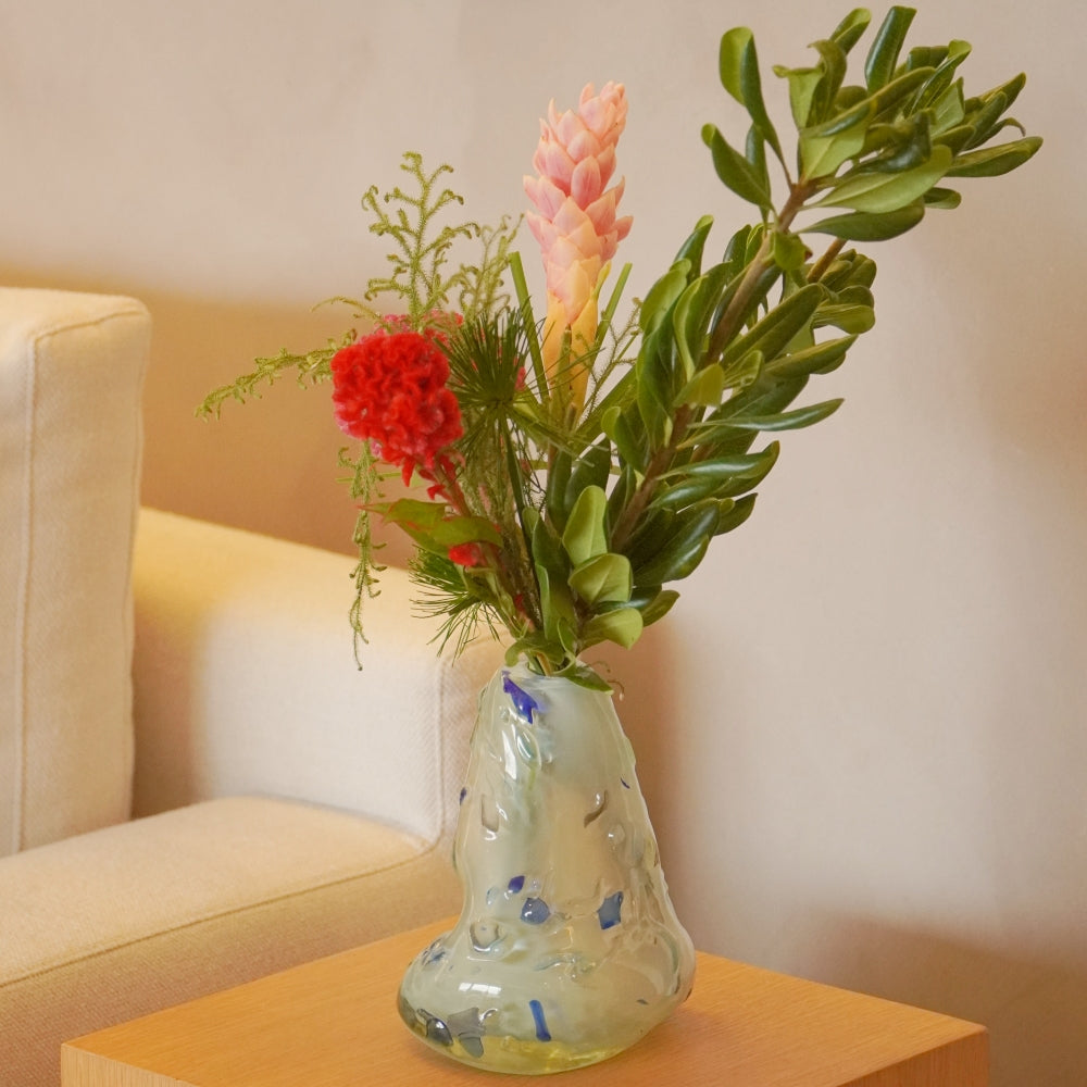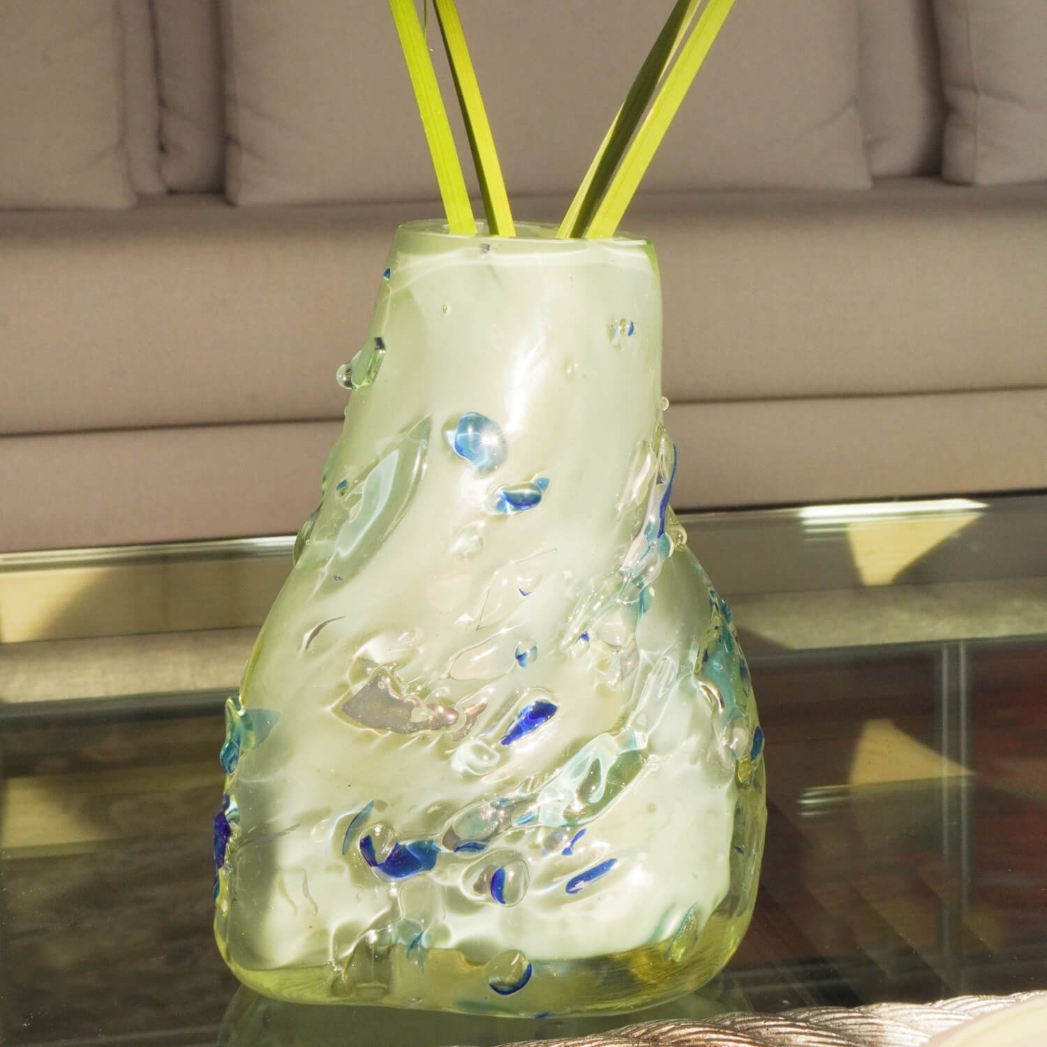 A coleção Flow é totalmente artesanal, desenvolvida com vidro soprado, uma técnica milenar que consiste em derreter o vidro a 1200 graus e soprar por uma cano metálico, e assim dar a forma que desejar, então cada cantinho é único e rico em detalhes . Você não estará adquirindo um vaso, mas sim, um vaso único que será só seu.