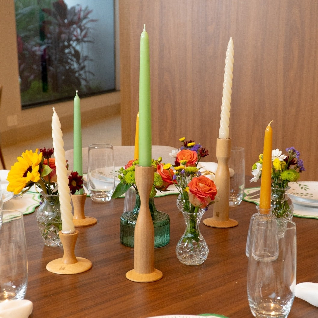 Use sua vela para castiçal twist marfim na mesa posta, combine com nosso jogo americano e nosso guardanapo de linho azul índigo e junte com as velas para castiçal azul e para o toque final coloque velas super twist G verde água para ter um mix de cor e tamanhos. Surpreenda quem estiver em volta da mesa com uma decoração linda e despojada.