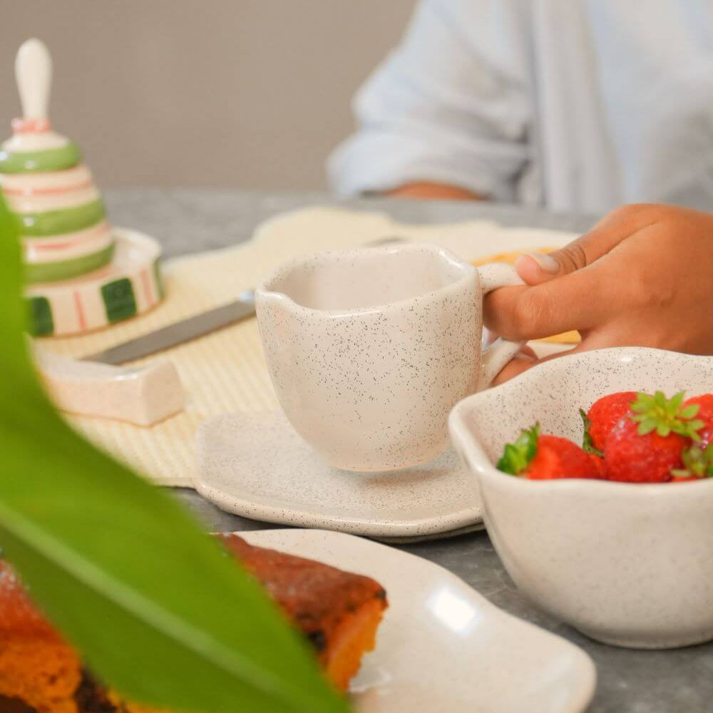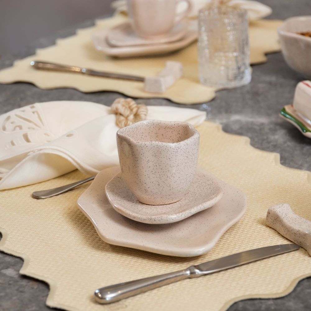 A xícara e pires de cerâmica Areia combinam bem com pratos e peças em tons neutros, criando uma mesa harmoniosa e sofisticada. Para uma composição mais alegre e cheia de vida combine com acessórios coloridos.